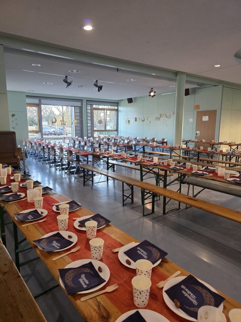 Das gemeinsame Fastenbrechen (Iftar) an der GMS Mühlacker war ein rundum gelungenes und sehr besonderes Ereignis. Etwa 200 Gäste kamen am Abend im Gebäude der Grundschule zusammen, um diesen wichtigen Moment miteinander zu teilen. Die Atmosphäre war von Anfang an feierlich, herzlich und geprägt von einem starken Gemeinschaftsgefühl.